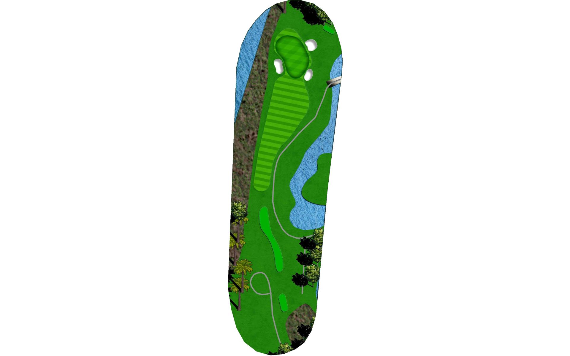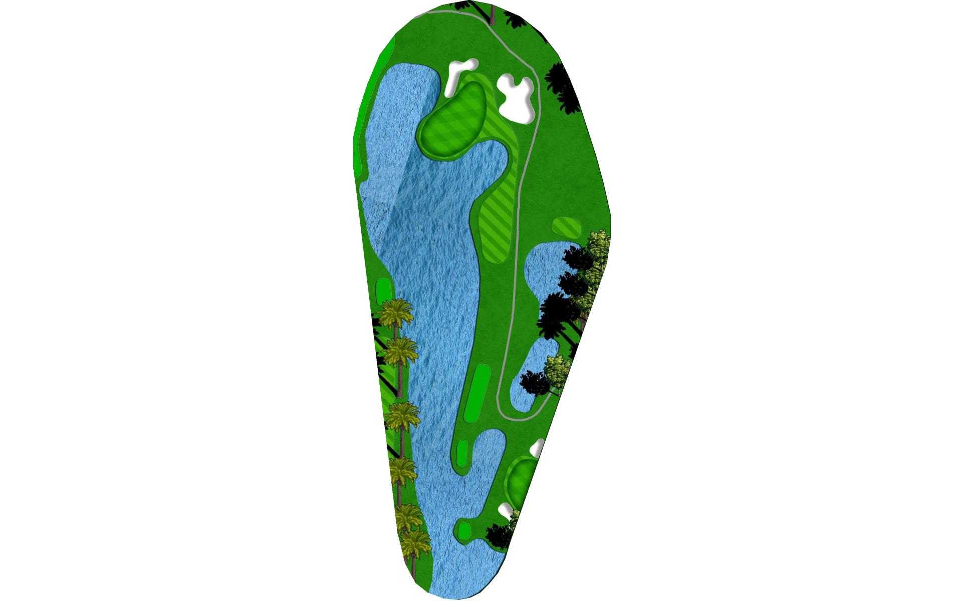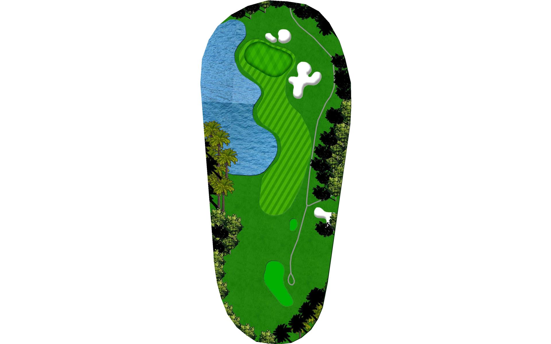 Three shots are better than two here. The first landing area is guarded by a long fairway bunker on the left. A short iron or wedge right center on your second shot will leave you in the best position for a perfect approach over the water and onto this massive green.